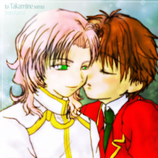 [シノカンヅメ]の管理人さま、神流様から頂いてしまいました西啓vv チャット参加者常連様になるとわかるのですが、 チャットとは名ばかりの私のオネダリ大会へと足を踏み入れてくださった神流さんv たっぷりとオネダリをして、見事戦利品をゲットしましたよおかあさーんっ!!(やめれ) 西啓大好きなのに西啓少なくて寂しい今日この頃な私の心を見事癒してくれました。 西啓増やせという暗示かと思いますが、七条さんの呪いに阻まれて無理のようです(笑) なんていうか・・・西園寺さんが嬉しそうで!! 啓太頑張ってるねっと悶えたくもなり、西園寺さんの嬉しそうな顔にも悶えたくなって、 もう、どうしましょう!!!(どうにでもして) 神流さん、有難うございましたーvvまたお願いします(え。) |